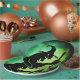Placa de papel com uma silhueta preta de uma velha bruxa, agitando um caldeirão sobre fundo preto e verde.