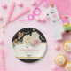 Esses pratos de papel modernos e elegantes apresentam um colorido buquê floral no topo sobre um fundo preto. O buquê tem rosas encantadoras em tons de creme, marfim e rosa, com lírios peruanos laranja e folhagens verdes. Abaixo do buquê há uma área de cor marfim para o seu texto personalizado. Há duas faixas douradas simuladas que percorrem a largura dos pratos. As palavras "Melissa's Bridal Shower" são impressas em rosa coral com a data do evento em verde sálvia e a palavra "Enjoy" em preto abaixo. Envie um e-mail para niteowlstudio@gmail.com se precisar de itens combinando ou precisar de ajuda para personalizar o texto.