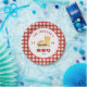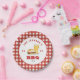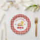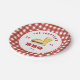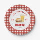 Piquenique familiar personalizado, festa de CHURRASCO, placa de papel com hambúrguer e cerveja com borda vermelha e branca de gingham. Personalize usando as caixas "Editar este modelo de design" no lado direito do item ou clique no botão azul "Personalizar" para organizar o texto, alterar as fontes e as cores.