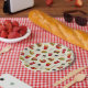 Estas placas de papel apresentam cheeseburgers, sanduíches de frango, nuggets de frango, sundaes de fudge quente, cones de sorvete de serviço macio e refrigerantes.