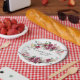 Esta bela placa de papel de Casamento apresenta rosas de cor d'água borgonha e borrão com a citação Felizmente, depois de começar aqui, a placa é projetada para coordenar com a coleção Charlotte Wedding. © Julie McIver