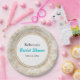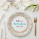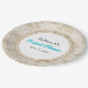 Esta placa de chá de panela (descartável) apresenta um fundo de burlap (burlap) com uma cobertura branca de renda. O centro da placa é branco e apresenta texto personalizável para o nome da noiva a ser e sua data de chá de panela.