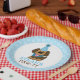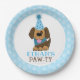 Este prato bonito apresenta um cão marrom em uma festa que tem uma borda de impressão azul e texto personalizado. Perfeito para qualquer aniversário!
