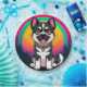 Ilustração de um animador cão animado sentado em frente a um fundo colorido do arco-íris, com um ambiente lúdico e cercado por uma paisagem serena de floresta, enfatizando alegria e arte vibrante.