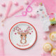 Veado de Natal bonito decorado com bolas vermelhas sobre fundo branco com placa de papel de quadro vermelho.