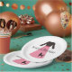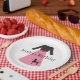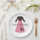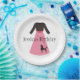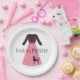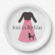 Retro-design divertido apresenta roupas femininas com saia rosa e poodle preto. Texto personalizável
