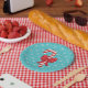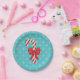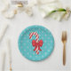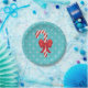 Um desenho animado branco e vermelho festivo, ilustrando uma deliciosa bengala doce de Natal com um belo arco vermelho. A cor de fundo é azul com um padrão de floco de neve.