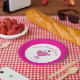 Doce, moderno e caprichoso Design inspirado em Kawaii com uma caneca de chocolate quente com chantilly e um pirulito de coração de chocolate.