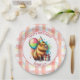 Adorable personalized capybara themed birthday party paper plates. A sweet watercolor capybara holding a balloon and birthday gift in pink and blue.