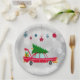 Placas de papel com um legal e velho carregando de carro vermelho, uma pinheira verde de natal em seu telhado e um presente guardado no tronco aberto. Tem um belo estilo retro-anos 50. Bolas de Natal, flocos de neve e estrelas penduradas no topo. Colocado sobre um fundo prateado com estrelas na moda espalhadas por aí.