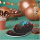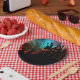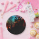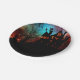 Paisagem fria com uma casa assombrada decorada para o Halloween, uma lua de cheio e uma árvore grande no fundo com cogumelos, cemitério, um zumbi e fantasma esperando para cumprimentá-lo.