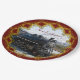 Chapas de papel com um comboio antiquado com uma montanha coberta de neve no fundo da casa de Natal.