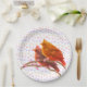 Casal de aves cardinais bonitinho em galhos florescentes de árvores com bolinhas multicoloridas em prato branco de papel de fundo.