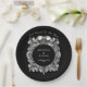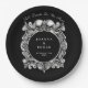 Este prato de papel de casamento com crânios florais góticos preto e branco pode ser personalizado com suas informações em tipografia moderna. Criado por Thisisnotme©