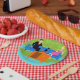 Esses Casais retrorados com Cat Paper Plates apresentam um casal de desenho tentando se aconchegar enquanto assistem televisão em um meio século de sofá azul moderno. O gato, porém, tem outras ideias. De um lado do sofá, há um homem bonito com um terno preto de gravata vermelha. Do outro lado do sofá de na moda, há uma linda mulher loira em uma forma de vestido rosa quente. As coisas estariam ficando excelentes se não fosse pelo gato preto, que tem reclamado da almofada do sofá central. Este estilo de 1960, design de arte minimalista é colocado numa sala de na moda. O pano de fundo do sofá é uma parede verde de pedra. No fundo do aqua, há um tapete redondo, verde, que combina com a parede de pedra. Na frente da design, vemos a parte de trás de um televisor laranja com orelhas de coelho, que parece estar tocando o programa favorito do gato.