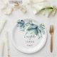 Esta placa de papel projetada para o casamento é mostrada com uma impressão de arte de eucalipto. Personalize este item e altere o texto do exemplo para o seu. Imagem licenciada