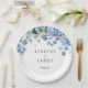 Esta placa de papel projetada para o casamento é mostrada com um romântico azul hydrangea watercolor impressão. Também oferecemos um guardanapo de papel equivalente. Personalize este item e altere o texto do exemplo para o seu com este modelo. Imagem licenciada