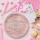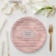Pratos de papel de casamento com padrão de listras dourado rosa e beijo de noiva projetados para serem personalizados rápida e facilmente de acordo com os detalhes do seu evento.