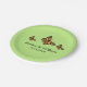 Lindo prato de papel do tema do casamento, com três borboletas cor de laranja Monarca em uma cor de fundo verde. Personalize o texto com os detalhes do evento.