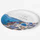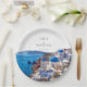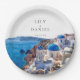 Elegantes pratos de papel de casamento de Santorini Grécia com aquarela podem ser personalizados com suas informações em tipografia moderna. Desenhado por Thisisnotme©
