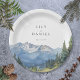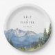 Esses pratos de papel para casamento de flores silvestres de montanha em aquarela moderna e elegante podem ser personalizados com suas informações em tipografia moderna. Projetado por Thisisnotme©