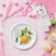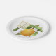 Peras inteiras de Ouro penduradas em meio a folhas verdes com flores brancas.