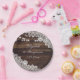Chapas românticas e elegantes de papel de festa de casamento rústico inspiradas em madeira de celeiro, rendas florais brancas e luzes de cordas.