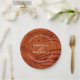 Pratos de papel de casamento laranja ferrugem e borgonha modernos, projetados com notas musicais borgonha em um fundo laranja ferrugem. O tema é 'Fazendo Doce Música Juntos' e todo o texto é personalizável. Itens correspondentes estão disponíveis. Também ideal para esquema de cores de outono.