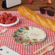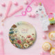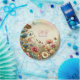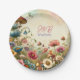 Placas de papel tematizadas do núcleo de chalé bonito para um casamento, janto de ensaio ou festa de chá de panela. Cogumelos, flores e borboletas aquosos, azuis e beges. Adicione iniciais de casal e data de casamento na área de personalização.