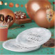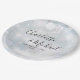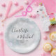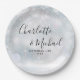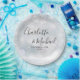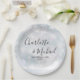 Escrito elegante em flocos de neve de inverno pratos de papel de casamento personalizados com nomes de estilo e sua data especial de casamento. Projetado por Thisnotme©