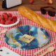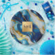 Uma placa de papel com um dourado falso, design marmoreado azul e branco.