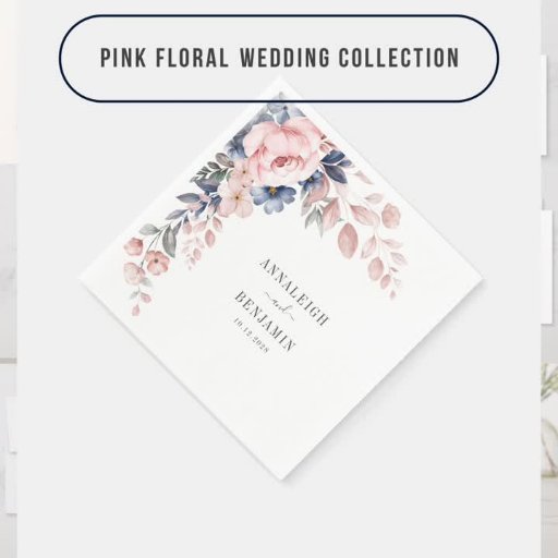 Planeje seu dia especial até os últimos detalhes dos guardanapos-coquetéis que apresentam um design moderno com flores rosas e azuis, folhagem verde e elegante tipografia de cinzas escuras. Altere facilmente os detalhes clicando no botão "Personalizar". Clique no botão "Personalizar" para alterar o plano de fundo, o tipo de fonte e o texto para corresponder à sua preferência e estilo