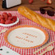 Este prato de papel personalizado apresenta um padrão geométrico ousado de meados do século moderno em laranja quente, rosa e amarelo envolvendo a borda, com os nomes do casal e a data do casamento centralizados em um fundo creme. A borda de azulejo mod traz uma energia retrô e vibrante que faz até mesmo a louça parecer intencional e com design à frente. Personalize com quaisquer nomes e datas para uma mesa de recepção coesa e atraente. Um ajuste perfeito para uma celebração de casamento boho, maximalista ou inspirada no vintage.
