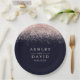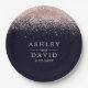Prato de papel para casamento moderno azul marinho com confete em rosa ouro. Lindos confetes em rosa ouro com glamour retrô simples contra um fundo azul marinho. Este design moderno personalizado pode ser facilmente personalizado com seus próprios detalhes.