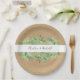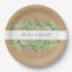 As folhas verdes e frescas de eucalipto enquadram seus nomes em tipografia elegante em um fundo de kraft rústico neste moderno país casado, com o tema prato de papel. Projetado por Thisnotme©
