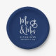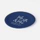 Placas de papel azul personalizado para sua recepção de casamento e eventos de casamento com "Sr. & Sra." escrito em um grande roteiro branco e uma ilustração branca de dois anéis de casamento juntos. Adicione sua data de sobrenome e casamento.