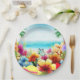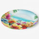 Esta placa de papel tem uma design divertida para o verão apresentando uma cena de praia com flores, borboletas, palmeiras e praia e oceano ao fundo. Isso seria excelente de ser usado para qualquer festa ou piquenique de verão.