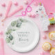 Prato de papel temático botânico moderno e trendy com eucalipto verde sobre fundo branco para chá de noiva.