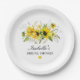 Um arranjo de girassóis amarelos rústicos decora o topo deste item de prato de papel. O nome da noiva é escrito em uma linda caligrafia. Chá de noiva e um lindo coração amarelo seguem.