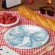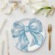Um charmoso design de prato de papel apresentando um grande laço azul em aquarela no centro. Este design simples, minimalista e elegante é perfeito para um chá de bebê para menino, um tema de chá de noiva como "Ela está dando o nó", ou uma celebração "Algo Azul Antes de Eu Me Casar", bem como outros temas de festa fofos.
