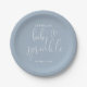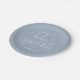 Este prato de papel para chá de bebê em azul poeira com letra cursiva elegante pode ser personalizado com seu nome e data do chá. Criado por Thisisnotme©