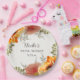 Elegantes pratos de papel customizados com pintura aquarela floral e folhagens em laranja queimado e coral vintage para chá de panela de noiva. Personalizados com o nome da noiva e a data do seu chá de panela.