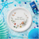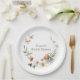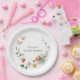 O produto do chá de bebê temático floresta encantada apresenta uma borda de aquarela com folhagens, cogumelos e borboletas. Personalize com suas informações ou clique em "Clique para personalizar ainda mais" para editar os estilos de fonte, tamanho e cores.
