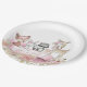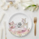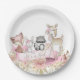 Pratos de papel para chá de bebê de menina com adoráveis animais bebês em um fundo de banner floral rosa. Estes pratos de papel para chá de bebê da floresta são facilmente personalizados para o seu evento adicionando o texto de sua escolha. Você também pode alterar a cor do fundo.