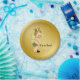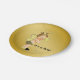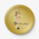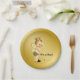 Pratos de papel para chá de bebê com adorável cabelo loiro claro e bebê menino vestindo um lindo traje de abelha em um rico fundo dourado com abelhas voando. Você pode adicionar texto para personalizar esses pratos de papel para chá de bebê com abelhas pretas e douradas, e você pode remover o fundo dourado para adicionar a cor de sua escolha.