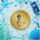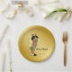 Pratos de papel de chá de bebê com adorável menino afro-americano bebê vestindo um lindo traje de abelha em um rico fundo dourado com abelhas voando. Você pode adicionar texto para personalizar estes pratos de papel de chá de bebê de abelha preta e dourada, e você pode remover o fundo dourado para adicionar a cor de sua escolha.