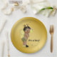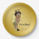 Pratos de papel para chá de bebê com abelhas com adorável menino bebê afro-americano vestido com um lindo traje de abelha em um rico fundo dourado com abelhas voando. Você pode adicionar texto para personalizar esses pratos de papel para chá de bebê com abelhas pretas e douradas, e você pode remover o fundo dourado para adicionar a cor de sua escolha.