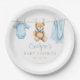 Esses pratos de papel para chá de bebê apresentam roupas azuis de bebê menino em um varal e podem ser personalizados com seu nome e data especial. Criado por Thisisnotme©