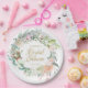 Um design elegante de prato de papel floral com texto dourado emoldurado por uma guirlanda de rosas doces de verão.