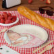 Pratos de papel para chá de bebê vintage meninas com adorável bebê dormindo enrolada em cobertores rosa e floral em um fundo vintage suave com o texto "É uma Menina!" no topo. Você pode adicionar texto no estilo de fonte de sua escolha para personalizar, ou excluir o texto de exemplo nestes doces pratos de papel para chá de bebê vintage.